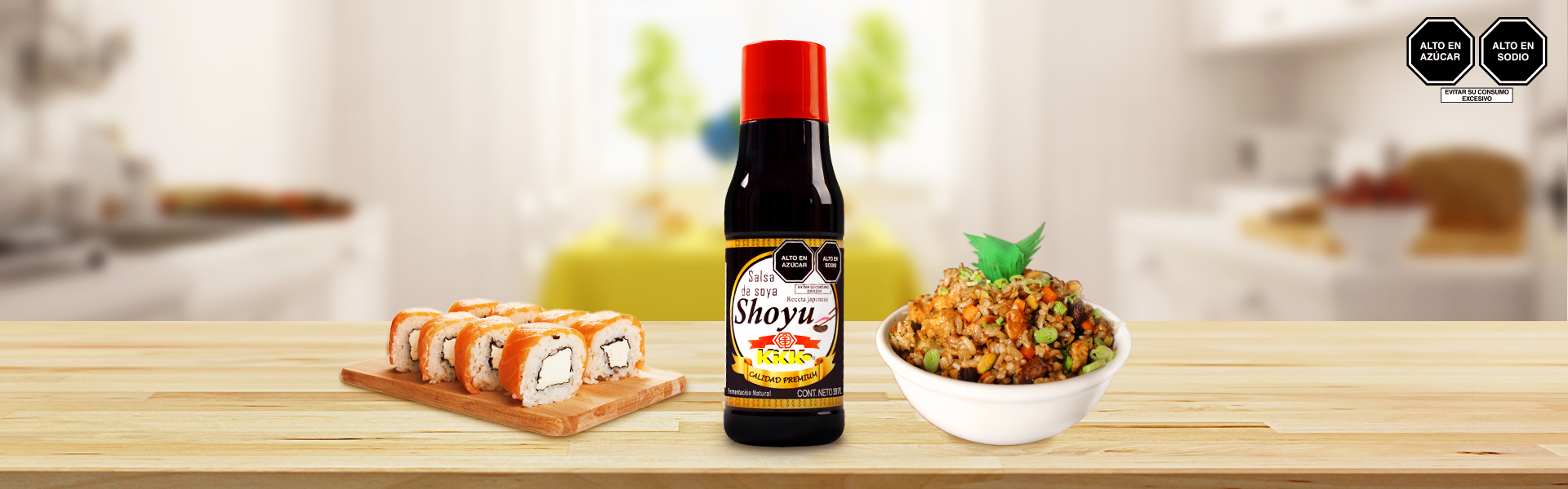 Salsa de Soya Premium de fuerte sabor y aroma penetrante, elaborada a partir de granos enteros de soya, con métodos completamente naturales y casi exclusivamente con caramelo de azúcar de caña sin aditivos, el cual si bien es cierto es de menor rendimiento, otorga a nuestra salsa una tonalidad diferente a las de otras salsa de soya, lo cual a su vez redunda en comidas de presentación más apetitosa y natural.
